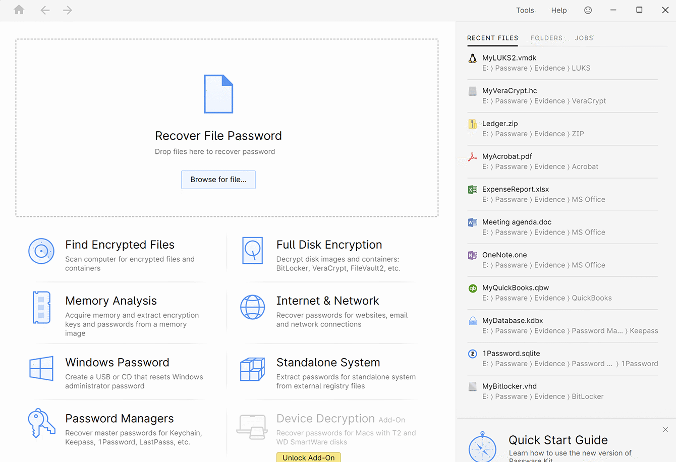 Optionales Device Decryption Add-on entsperrt, entschlüsselt und stellt Passwörter für Western Digital My Passport- und My Book-Laufwerke, Lenovo ThinkPads sowie Festplatten von Macs mit Apple T2-Sicherheitschips wieder her, einschließlich solcher, die durch ein EFI-Firmware-Passwort geschützt sind. Verfügbar für Strafverfolgungsbehörden und andere Regierungsorganisationen. Kontaktieren Sie den Vertrieb für weitere Informationen.